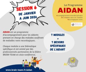 - Programme AIDAN 2026Pour répondre aux besoins des aidants dans leur vie quotidienne, pour les conseiller et les aider dans leurs démarches et questionnements, BRAIN-TEAM propose le programme AIDAN (Accompagnement Interdisciplinaire Des Aidants dans les maladies Neurologiques rares) BRAIN-TEAM propose le programme AIDAN (Accompagnement Interdisciplinaire Des Aidants dans les maladies Neurologiques rares) à destination des aidants accompagnant des… Lire la suite : Programme AIDAN 2026